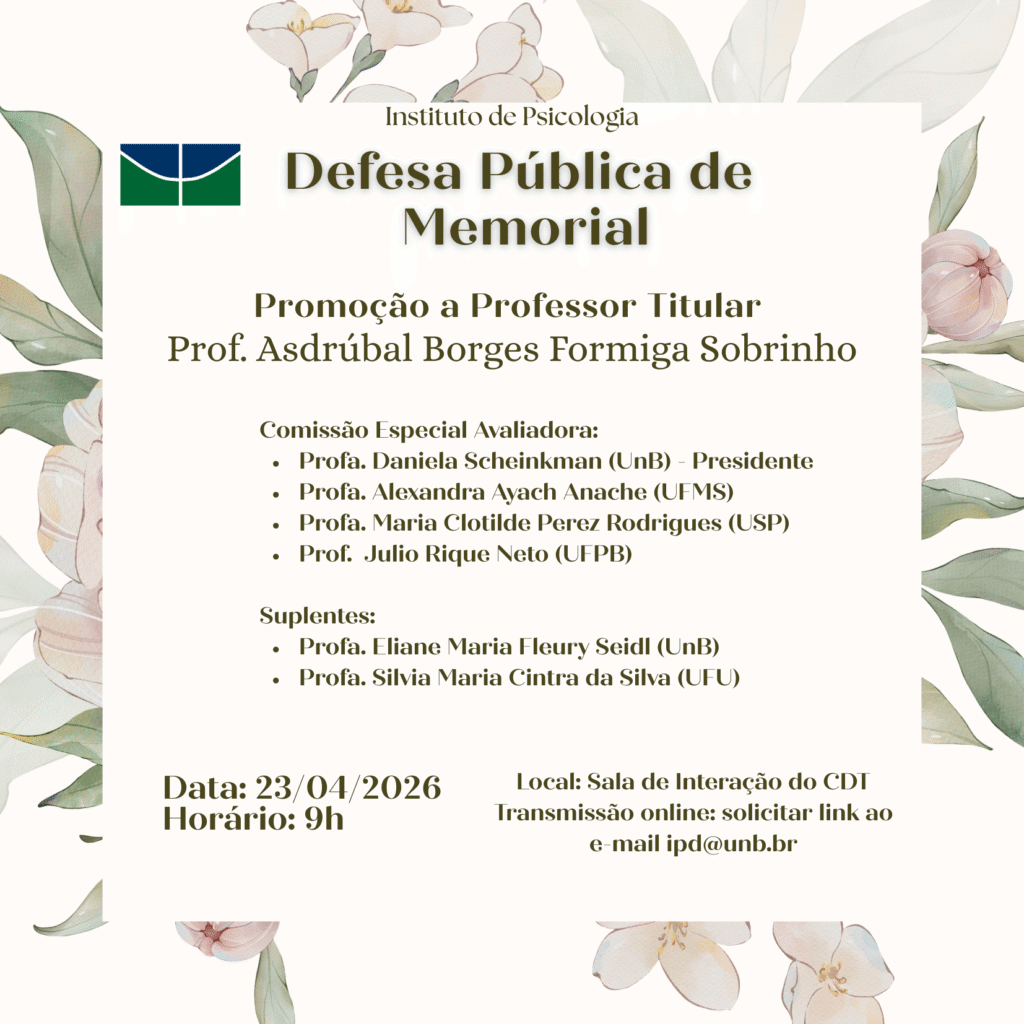 Convidamos a comunidade do IP para a defesa pública de memorial do prof. Asdrúbal Borges Formiga Sobrinho com vistas à promoção funcional à classe E (Titular). A defesa acontecerá no dia 23/04/2026, quinta-feira, às 9h numa sala virtual da plataforma Microsoft Teams.