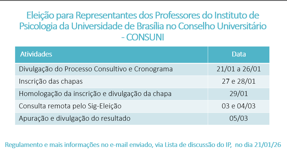 Divulgamos, para conhecimento, o Regulamento da Consulta para Representantes dos Professores do Instituto de Psicologia da Universidade de Brasília no Conselho Universitário – CONSUNI e o Cronograma atualizado.